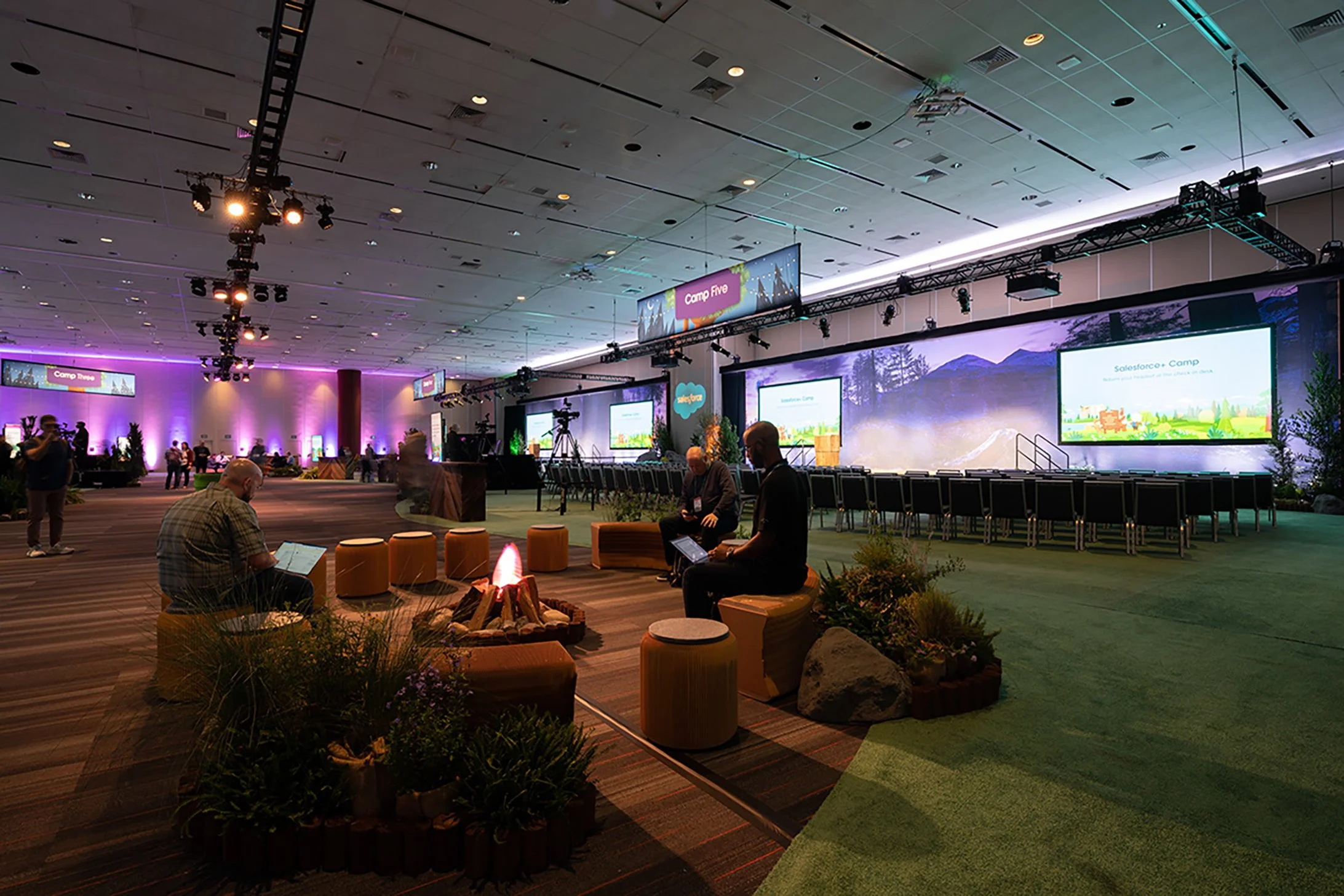 Salesforce+ Camp marked a key innovation at Dreamforce, hosting five simultaneous silent disco-style breakout sessions each day throughout the three-day event. This dynamic, immersive experience redefined attendee engagement while maintaining the national park theme, positioning Salesforce+ as a leader in cutting-edge event programming