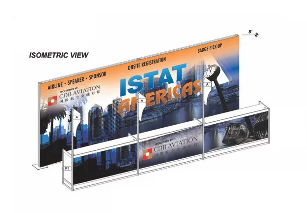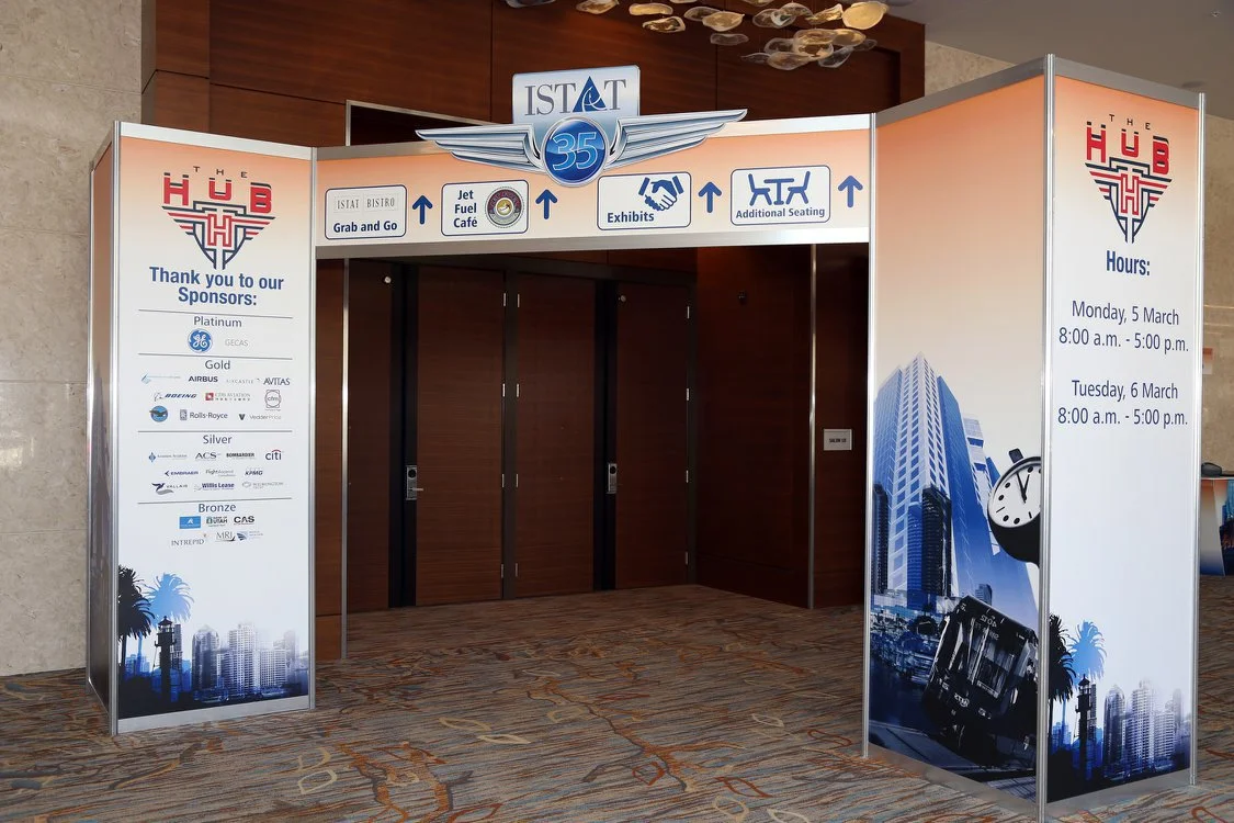 Launch a new brand language for ISTAT’s four annual international global events, beginning with ISTAT Americas in San Diego. Design a comprehensive conference graphic program that captures the spirit of aviation innovation and location while honoring the organization’s global influence. The program should include key visual elements such as banners, signage, digital displays, and print materials that align with the new ISTAT brand language and the event's coastal location, creating a cohesive and engaging experience for attendees.