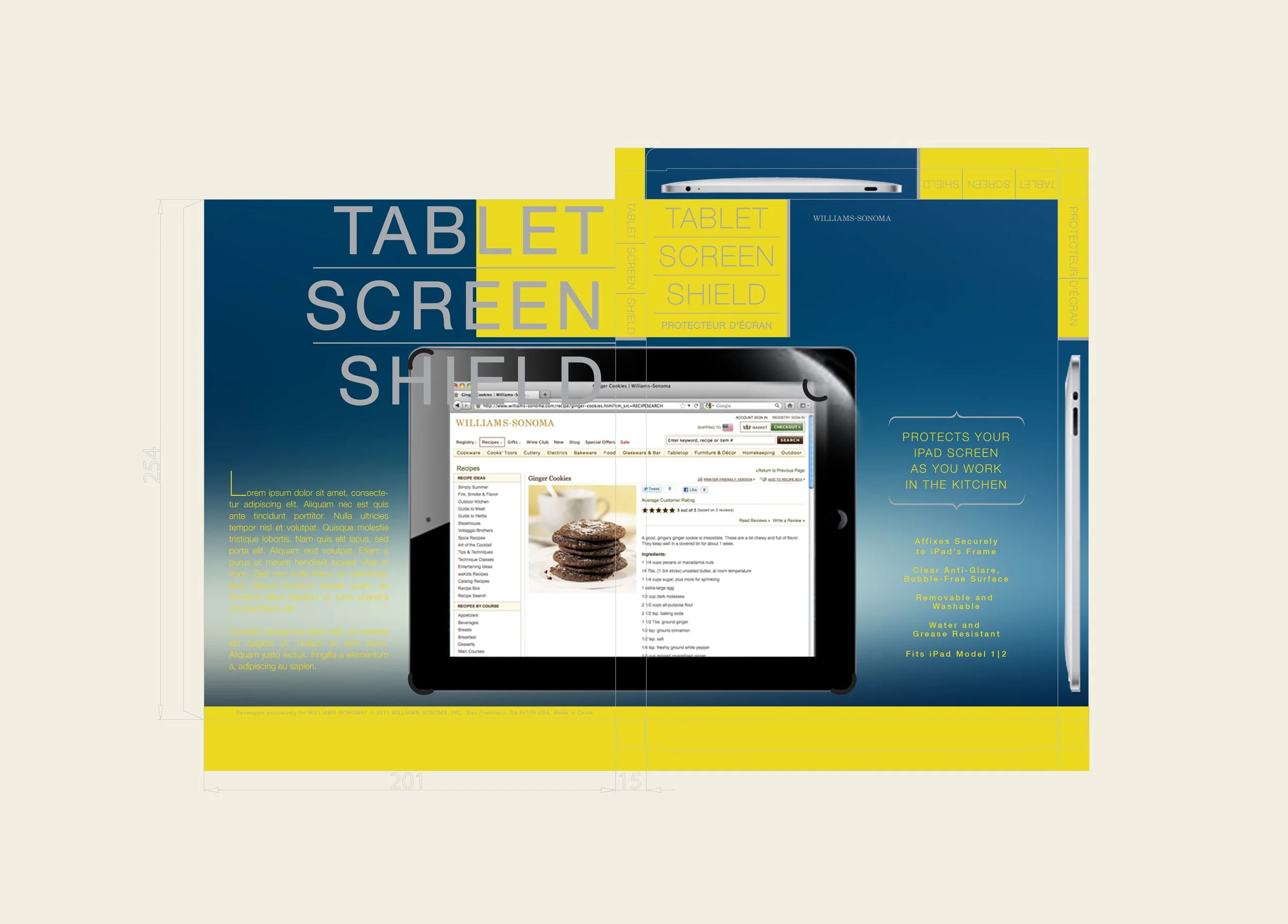 Create elegant packaging for a new Williams Sonoma iPad holder and iPad shield that showcases both functionality and aesthetic appeal. The design should highlight the iPad holder’s versatility in the kitchen for accessing recipes and videos, while the iPad shield’s packaging must emphasize durability and protection.